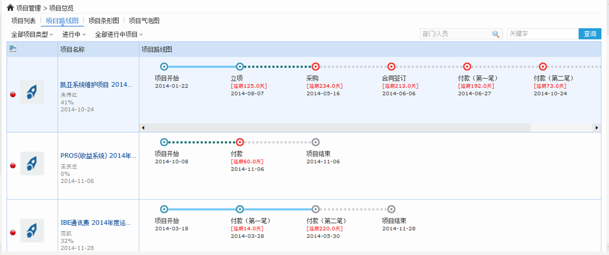 2、实现了对项目全生命周期的全流程管控, PMO和科室经理能通过可视化界面进行多项目监控。n 提供给深航项目团队及乙方企业一个开放的项目沟通平台,及时反馈项目执行的状态及问题,使深航IT项目的风险和问题及早发现并解决。