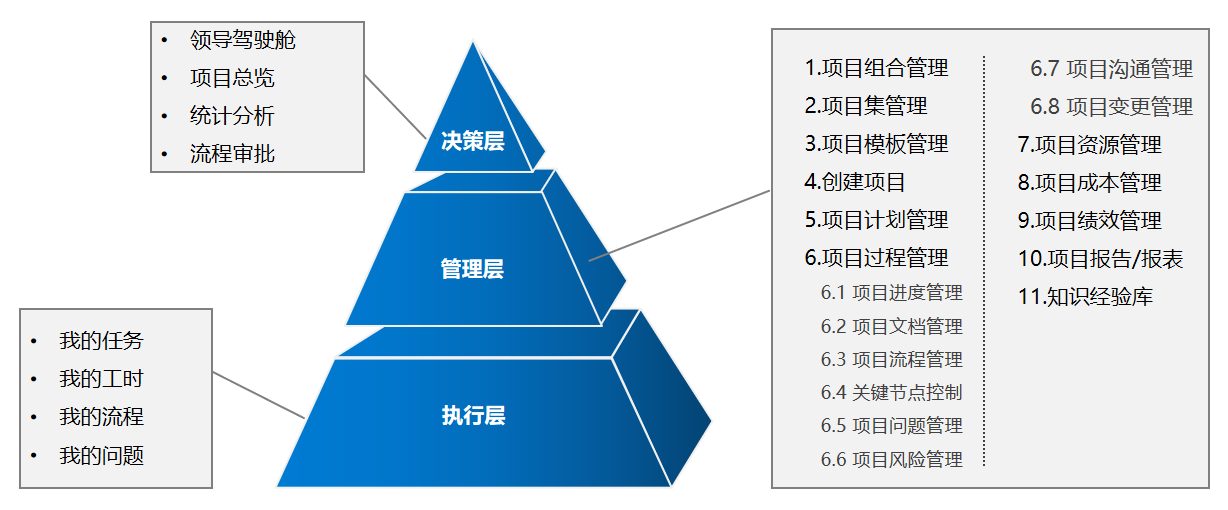 iMIS-PMX系统的主要功能面向项目管理的三个层级,并可进行高度定制,以满足企业的个性化需求。