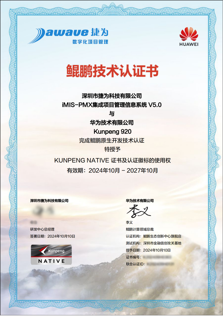 为加速推进工业软件国产化,捷为产品需要在服务器、操作系统、数据库等层级进行国产化适配。捷为产品已经适配过国产化操作系统(如:麒麟中标)和国产化数据库(如:达梦)。近日,经华为技术有限公司评测,捷为iMIS-PMX系统与华为Kunpeng 920完成鲲鹏原生开发技术认证。