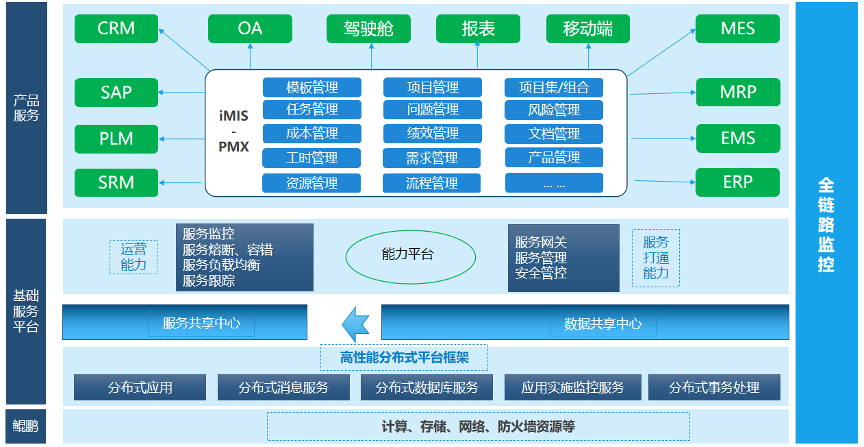 捷为iMIS-PMX系统基于鲲鹏的集成架构设计如下图所示,运用华为鲲鹏的计算、存储、网络、防火墙资源,通过基础服务平台的服务监控、服务熔断和容错、服务负载均衡、服务跟踪等运营能力和服务网关、服务管理、安全管控等服务打通能力,提供iMIS-PMX各种微服务及与其他IT系统的集成服务。