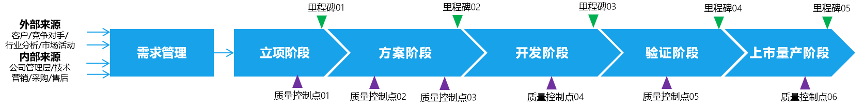 其次,通过立项阶段、方案阶段、开发阶段、验证阶段和上市量产阶段的全过程,并在若干里程碑节点和质量控制点按行业和企业标准进行管控,确保按计划、按质量和按成本要求完成产品研发项目。