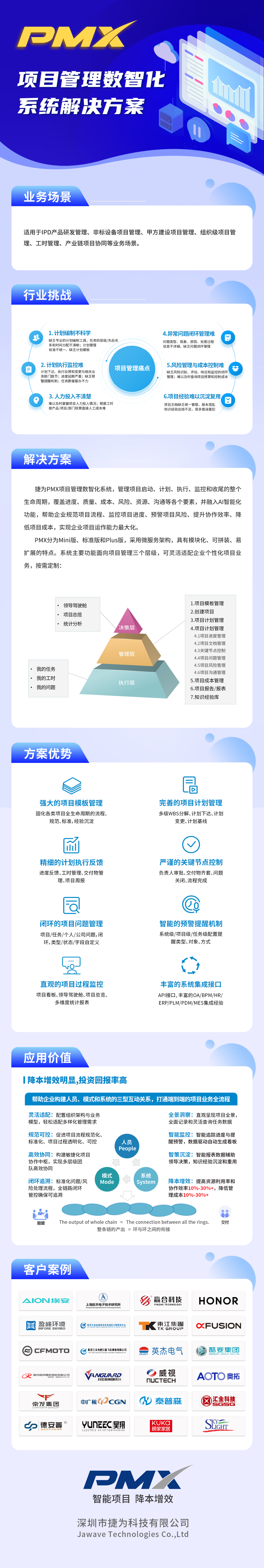 PMX V6.0项目管理数智化系统重磅来袭,帮您解决项目计划编制不科学、计划执行监控难、人力投入不清楚、异常问题闭环管理难、风险管理与成本控制难、知识经验难以沉淀复用等问题,从而降低管理成本20%+,提高资源利用率和协作效率20%+。欢迎垂询!