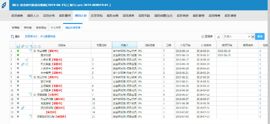 在iMIS-PM中「甘特图」直观展示项目计划(WBS),各部门和人员职责,项目任务父子关系、前后关系一目了然,项目负责人随时查看项目进展情况,不同项目阶段、任务、里程碑的时间节点都一目了然,快速定位项目难点,集中精力解决项目建设中的难点、痛点、堵点问题。