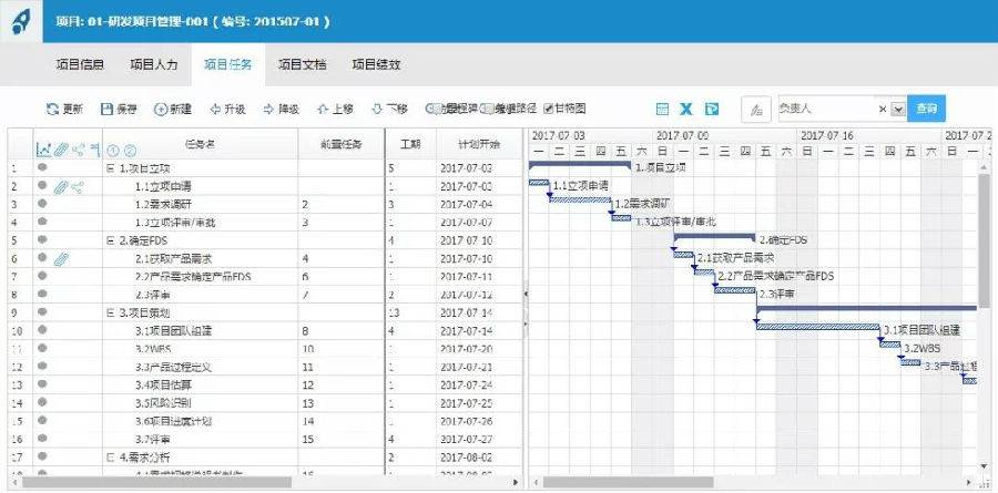 ●支持多级计划形式:里程碑计划、1/2/3/4级项目计划。项目计划以甘特图形式直观展示,有缩放功能。可显示任务的先后置关系;可选择任务层级代号,批量展开相应层级的所有任务;可选择显示里程碑任务或关键路径。