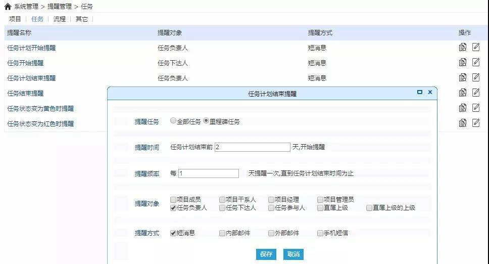 ●支持智能预警提醒和手动提醒设置(可定时)。项目/任务启动、项目/任务完成、计划变更、问题提交等时候,系统自动发送消息提醒(短消息、邮件、手机短信、企业微信等形式)给相关项目人员。