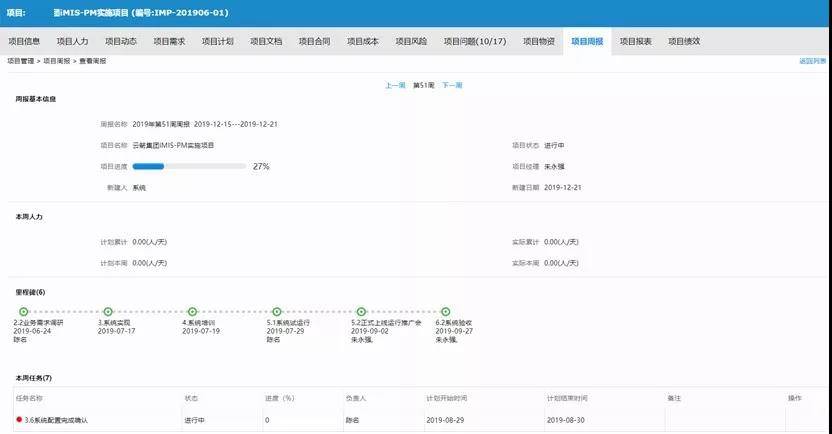 ●可根据需要定义项目周报模块,系统根据项目过程数据自动生成项目周报,系统也提供项目月报功能,供相关领导和项目干系人及时了解项目计划执行中的重要信息。