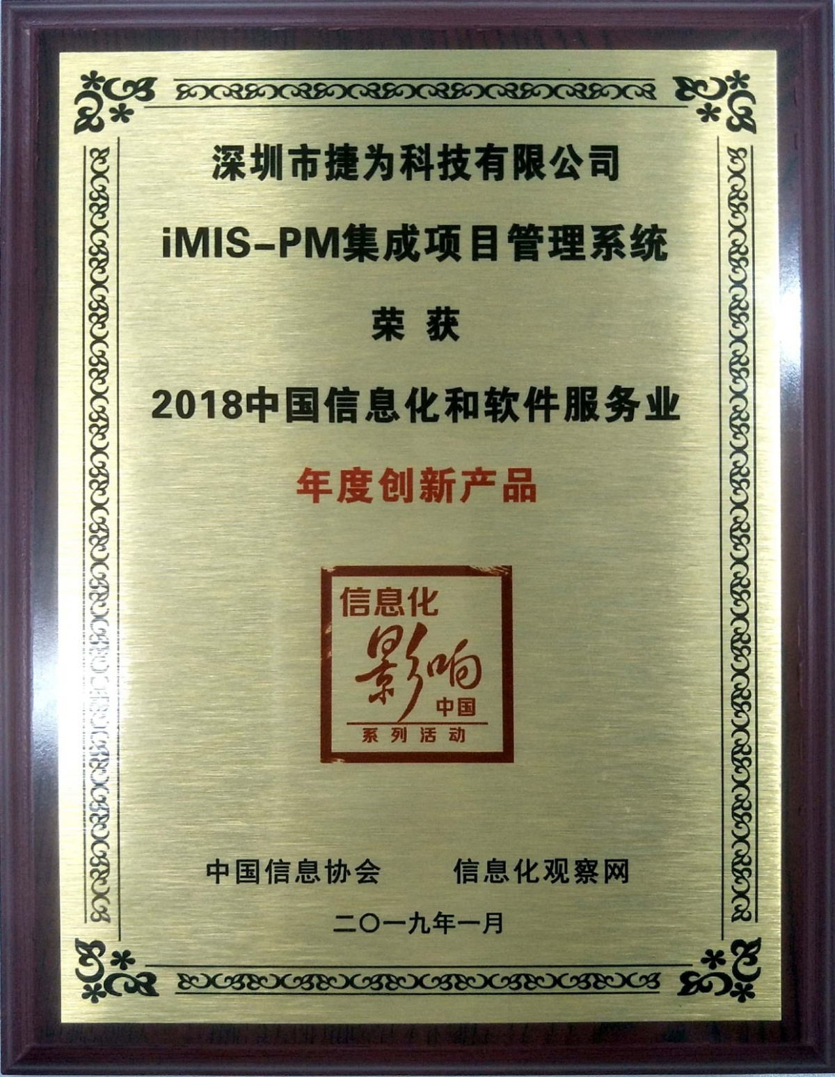 近日,由中国信息协会主办,信息化观察网、中国信息化网共同承办的“2018第二届中国信息化和软件服务业年度风云榜”的评选活动盛大揭幕,捷为iMIS-PM集成项目管理系统凭借在产品功能、创新技术等方面的优势,荣获“年度创新产品”奖。
