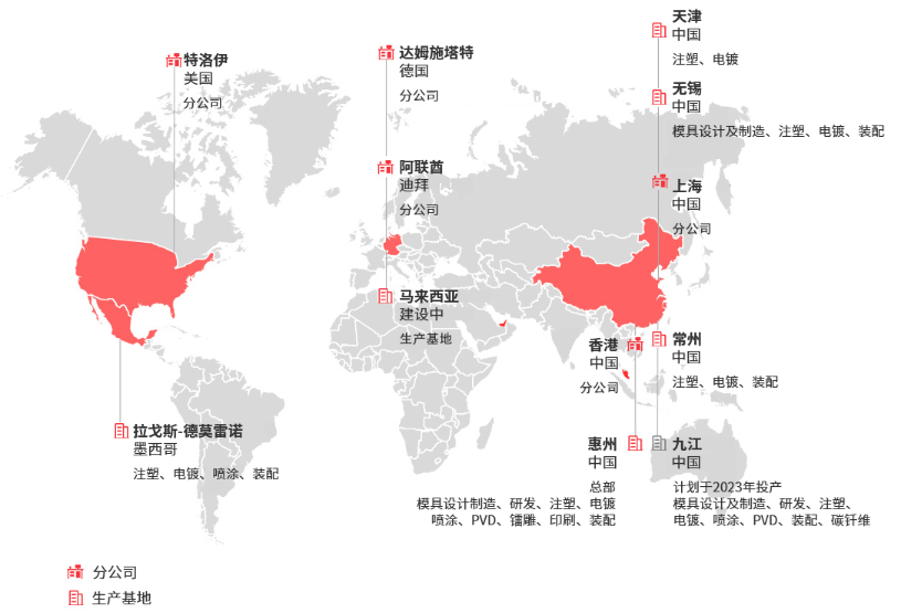 随着集团的不断发展,信邦控股将电镀、喷涂、PVD、镭雕、印刷、装配、热压和低压注塑等多种工艺有机结合,从传统的小型零件供应商发展升级为大型零件和组装零件供应商。同时,信邦控股抓住了新能源汽车崛起的浪潮,拓展并成功进入了氛围灯领域、车载屏领域和汽车ABC柱和门槛领域。信邦控股还在积极研发更加环保的表面处理技术(CPP)和新材料领域(碳纤维)。