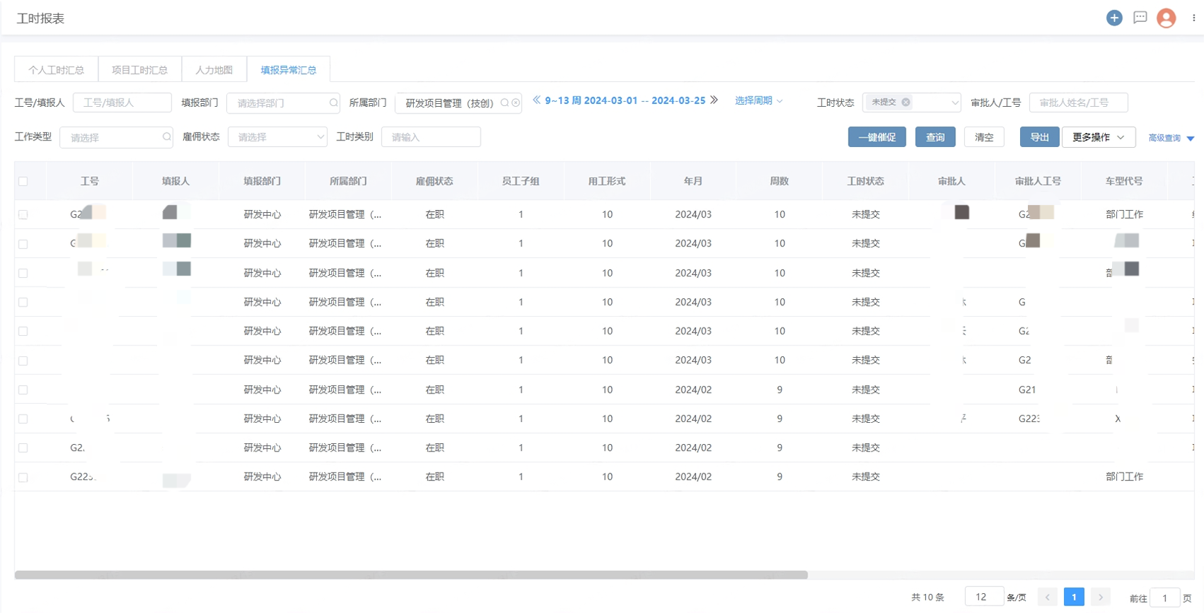 ▲ 填报异常时,无论是填报工时不足还是完全未填报,系统都能清晰展示,管理者还能一键催促。