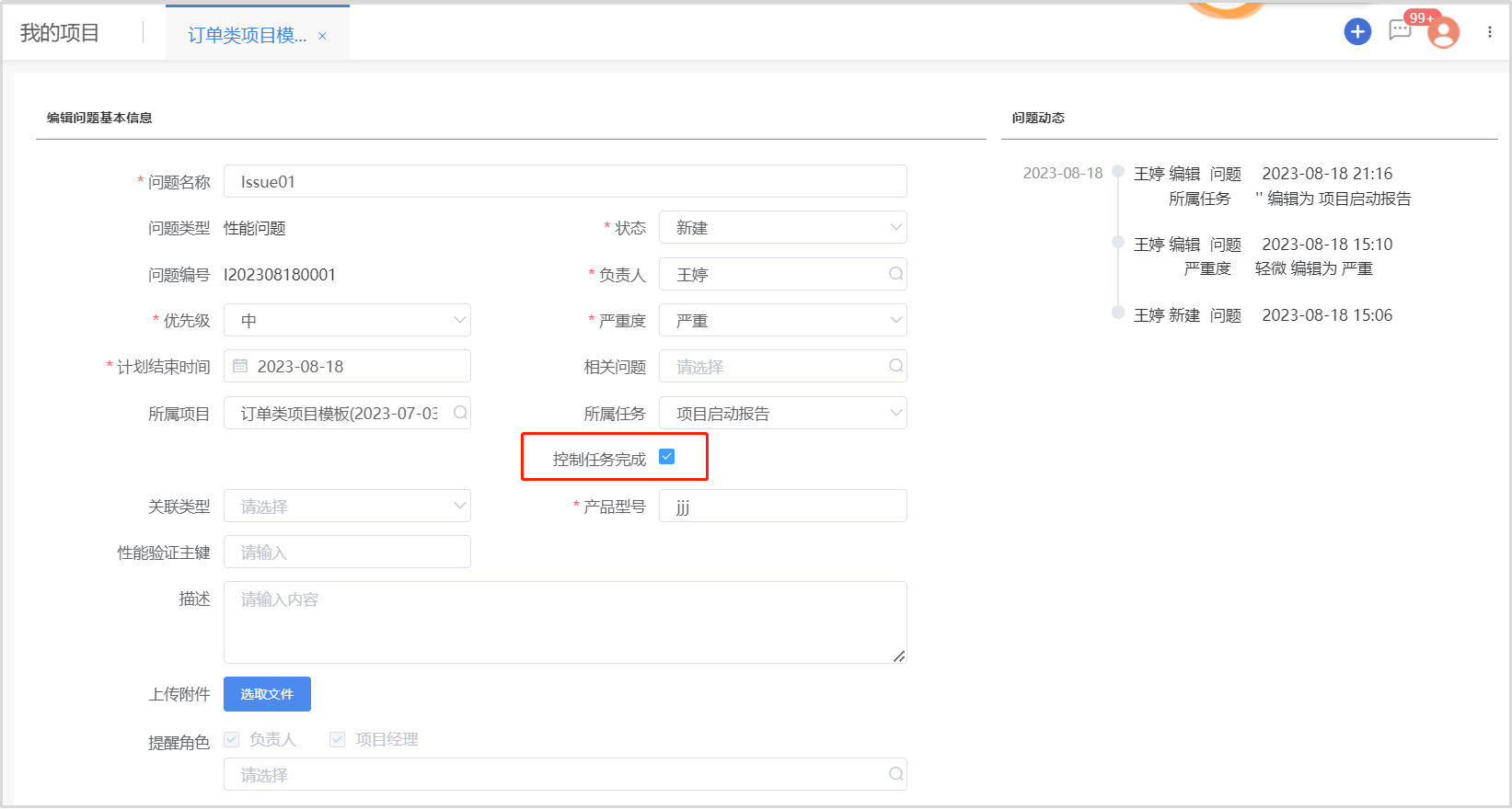 iMIS-PMX支持在任务中新建和管理关联问题,并可设置问题“控制任务完成”,即该问题解决后关联任务才能完成。通过这样的配置,可以将项目计划执行与项目质量控制结合起来。