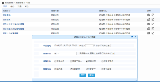 n 项目/任务状态更新时,系统自动发出消息提醒(如任务启动提醒、任务定期提醒、任务完成提醒、添加备注提醒等);提醒消息可以短消息、邮件、手机短息的形式发送给相关项目人员。
