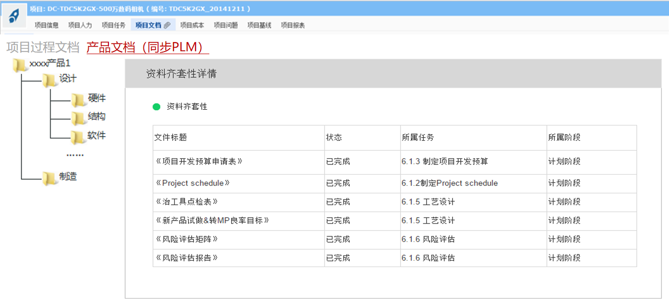 在iMIS-PM系统中,可以实时动态查看PDM系统同步过来的产品文档及其状态、齐套性。