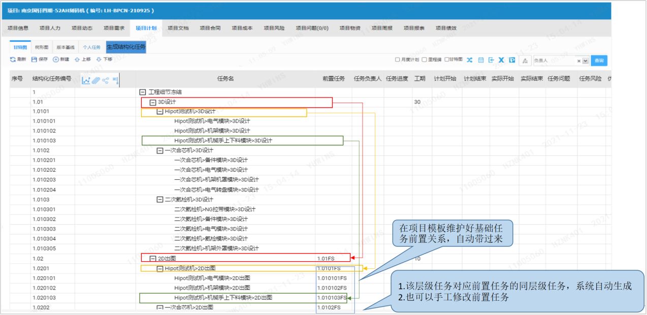 支持根据BOM按一定规则自动生成结构化任务插入到项目主计划中,以便实现更精细化的装备制造项目计划管理。