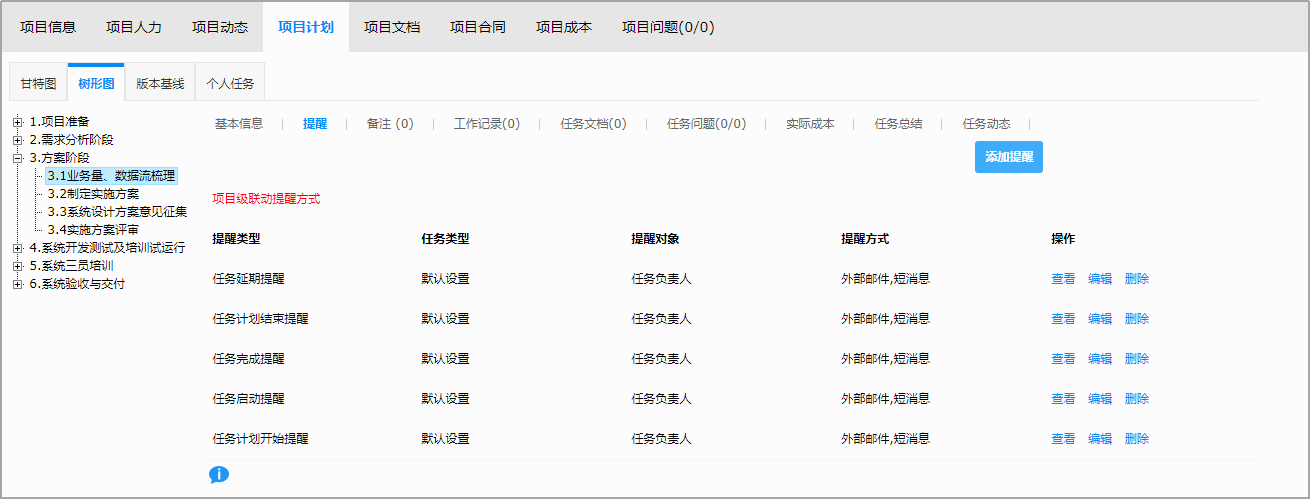 5.预警提醒缺机制:在任务状态变化、前置任务完成、计划即将到期、计划延期、计划变更等情况发生时,缺乏有效的预警提醒机制,无法跟催督办,易导致项目实际执行步骤与计划脱钩,即计划的两张皮现象。