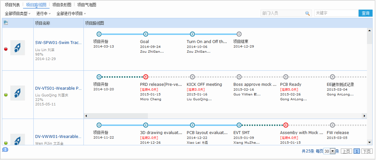 支持显示项目总览列表和里程碑路线图,直观展示项目进展情况(包括正常进行、轻微超期和严重超期的项目),方便进入到所关注项目的详情页面了解项目的具体情况。